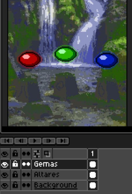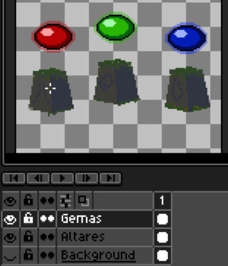 Las capas son como diferentes imágenes puestas una encima de la otra, y pulsando en ellas podemos escoger en cual dibujamos. Por ejemplo, hemos creado el siguiente dibujo con tres capas: gemas, altares y background.